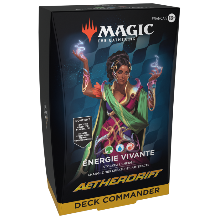 En Commander, quatre joueurs s'affrontent pour montrer leur force et leur stratégie ; mais seulement l'un d'entre eux sortira vainqueur de cette bataille. Chaque deck Commander prêt-à-jouer de 100 cartes Aetherdrift permet aux fans de Commander de venir dans votre magasin, d'acheter un deck et de jouer sans plus attendre.