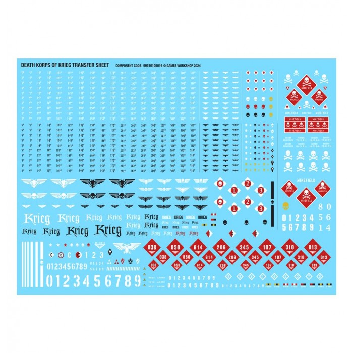 Les Escouades d'État-major de Krieg sont menées par des représentants de l'Officio Prefectus, la plupart du temps un Commissaire de haut rang, assisté d'une suite de vétérans et d'officiers subalternes. Ils mènent depuis l'avant et on les retrouve souvent au plus fort des combats. Ce kit en plastique permet d'assembler une Escouade d'État-major de Krieg pour vos armées de l'Astra Militarum à Warhammer 40,000. L'unité consiste en un Seigneur Commissaire, cinq Gardes Impériaux Vétérans, et un Servoscribe, ajoutant un ensemble de spécialistes à votre force. Le Seigneur Commissaire peut être équipé d'un pistolet à plasma ou d'un fouet dans sa main droite, et d'un gantelet énergétique ou d'une épée énergétique au fourreau et d'une main qui pointe pour son autre bras. Un Garde Impérial Vétéran de votre unité peut être assemblé avec un pistolet laser, un pistolet bolter ou un pistolet à plasma dans la main droite, et une épée tronçonneuse, une arme énergétique ou une matraque de tranchée dans la main gauche. Un autre Garde Impérial peut emporter au combat un bolter, un fusil à plasma, un fuseur ou un lance-grenades, avec grenades ou munitions de lance-grenades comme options d'accessoires de paquetage. Les Gardes Impériaux restants portent respectivement l'étendard régimentaire, le vox de maître, et des contre-agents alchymiques. De plus, tout un ensemble d'accessoires optionnels, dont des pelles, vous permet de décorer encore plus vos figurines. Ce kit est composé de 81 éléments en plastique, de 6x Socles Ronds Citadel de 25mm, et de 1x Socle Rond Citadel de 32mm. Ce set contient également 1x Planche de Décalcos du Death Korps de Krieg, comprenant 803 décalcos pour personnaliser vos figurines. Ces figurines sont fournies non peintes et nécessitent assemblage – nous recommandons d’employer la Colle Plastique Citadel et la peinture Citadel Colour.