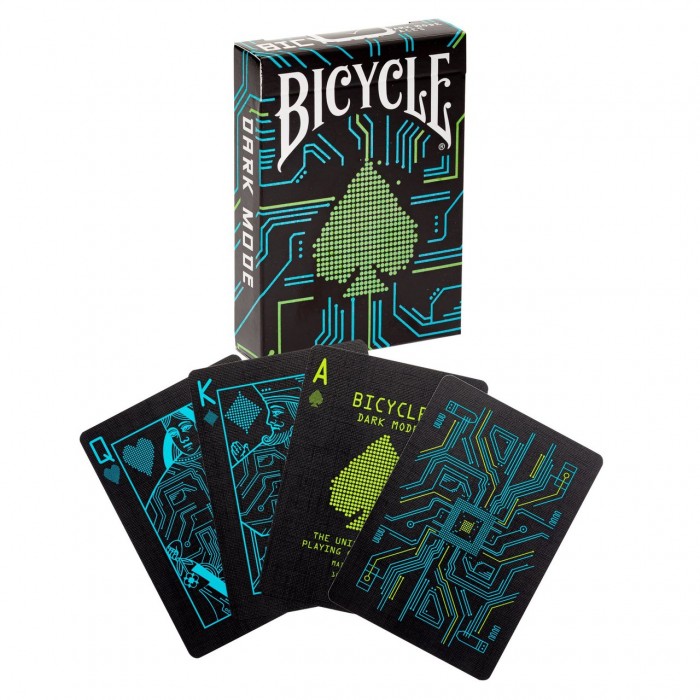Résolument modernes, les cartes Dark Mode insufflent de l’énergie à vos soirées jeux. Leur palette de couleurs est inversée et le dos des cartes ainsi que les figures sont personnalisés, comme pour inviter le monde numérique dans votre salon. - Finition brevetée Classic Air-Cushion® - Performances de glisse optimale, facilite aussi le mélange des cartes - Imprimé avec des encres végétales non toxiques et entièrement recyclable - Un design complètement retravaillé et moderne - Jeu de 52 cartes (plus deux jokers) - Format poker : 88 x 63 mm