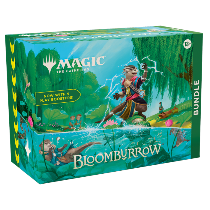 Ce bundle Bloomburrow inclut 9 boosters de jeu Bloomburrow, plus une carte Premium traditionnelle arborant une illustration alternative exclusive au bundle, 15 cartes de terrain de base Premium traditionnelles (dont 5 terrains pleine illustration Premium), 15 terrains pleine illustration non-Premium, 1 compteur de points de vie Spindown géant, 1 boîte de rangement de cartes et 2 fiches de référence. Chaque booster de jeu contient 14 cartes Magic: The Gathering et 1 carte de jeton/publicitaire ou carte d'illustration, avec une combinaison de 1 à 4 cartes de rareté rare ou supérieure, 3 à 5 inhabituelles, 6 à 9 courantes et 1 terrain. Une carte de n'importe quelle rareté est Premium traditionnelle et la carte de terrain est également une carte Premium traditionnelle dans 20 % des boosters de jeu.