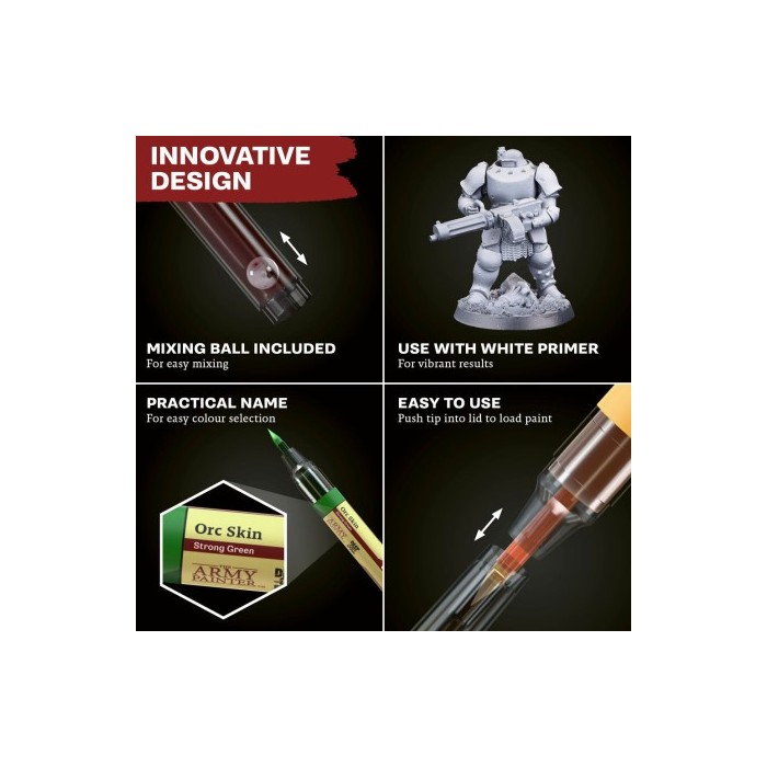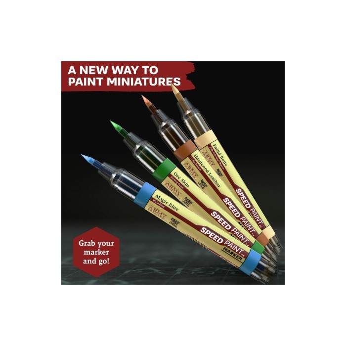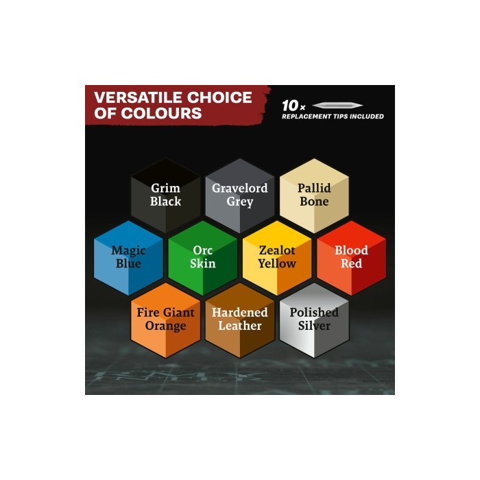- 10 Speedpaint Markers : Magic Blue, Fire Giant Orange, Hardened Leather, Grim Black, Pallid Bone, Orc Skin, Zealot Yellow, Gravelord Grey, Blood Red, Polished Silver (metallic)