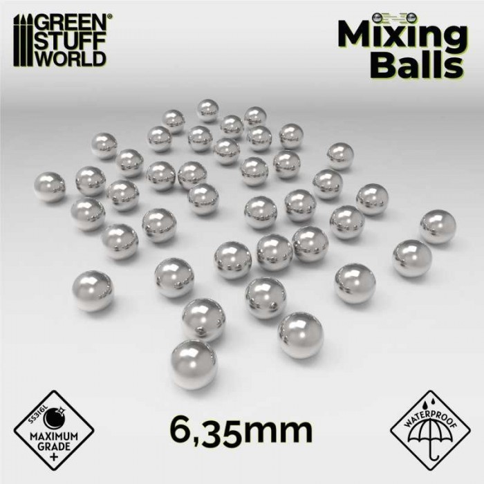 Boules de mélange de peinture en acier inoxydable pour mélanger la peinture avec un revêtement spécial qui prévient l'oxydation après un contact prolongé avec de la peinture. Il n'y magnétique, mais peuvent être attirés par les aimants.Permet d'avoir rapidement un mélange uniforme qui vous garantira : - une plus longue durée de vie pour vos pots de peinture : lorsqu'on prend de la peinture dans un pot mal mélangé, on récupère plus de medium que de pigments, le pot aura donc tendance à sécher plus vite si le mélange est mal fait. - des peintures plus mates : le medium acrylique huileux ayant tendance à rester à la surface des pots alors que les pigments plus lourds sont au fond.Sachet contenant 40 billes agitateurs en acier inoxydable de 6,35 mm de diamètre, idéal pour les plus petits pots de peinture de 0 à 30ml format de Green Stuff World, Citadel, etcPoids approximatif par balle 1g.Qualité SS316L