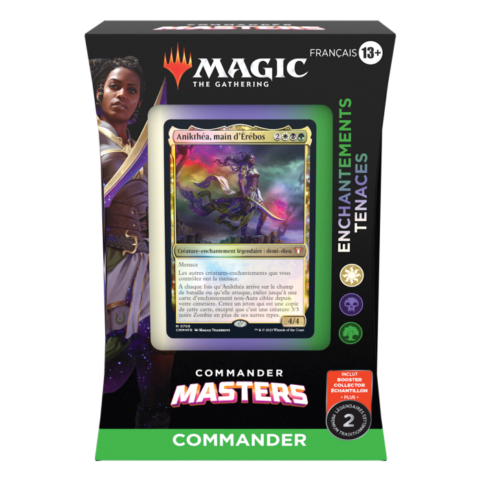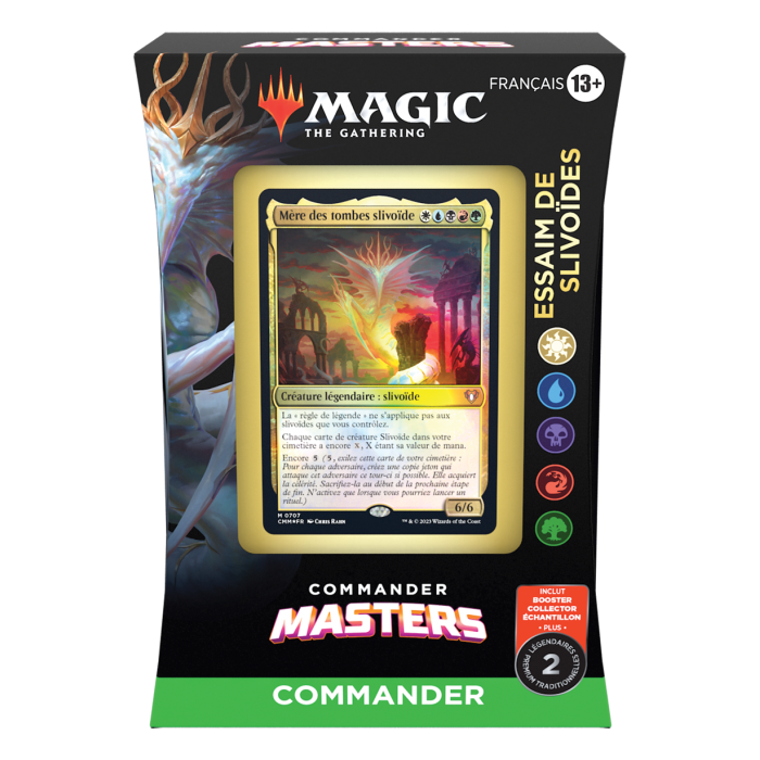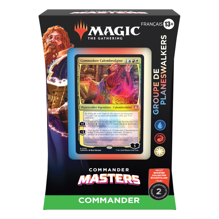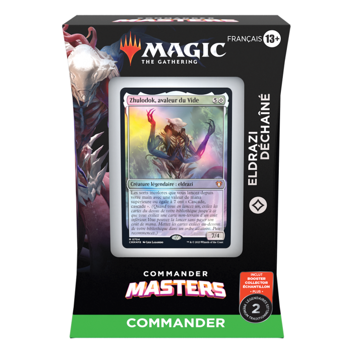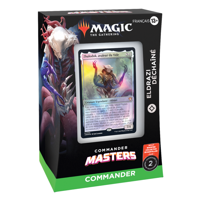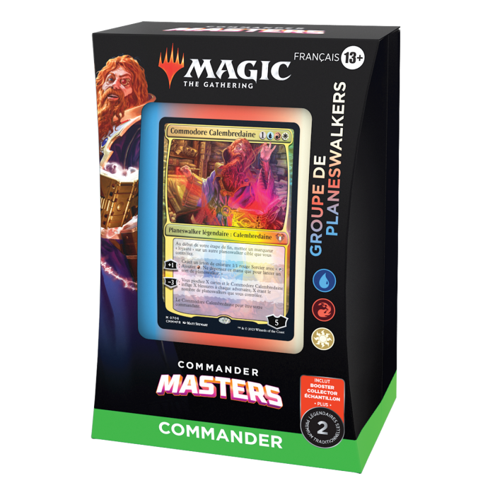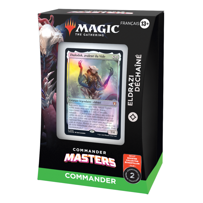 Chaque deck Commander Commander Masters contient 1 deck prêt-à-jouer de 100 cartes Magic (2 cartes de créature légendaire Premium traditionnelles, 98 cartes non-Premium), 1 booster collector échantillon de 2 cartes, 1 commandant de présentation super Premium (un exemplaire de la carte de commandant sur du papier cartonné avec une texture Premium sur la bordure et l’illustration), 10 jetons recto-verso, 1 boîte de deck (pouvant contenir 100 cartes avec protège-cartes), 1 roue de points de vie, 1 feuillet de stratégie et 1 fiche de référence.