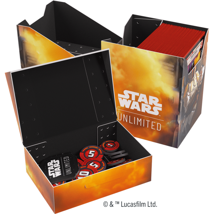 La Soft Crate est la solution tout-en-un durable pour les joueurs de Star Wars ™ : Unlimited. Cette boîte de deck imprimée en couleur regorge de fonctionnalités ingénieuses. Elle protège un jeu complet à double pochette de 60 cartes et comprend une boîte à jetons innovante ! Cette boîte à jetons est dotée d'un mécanisme de verrouillage à clic intelligent pour garder tous les jetons stockés en toute sécurité. Une fois ouvert, le couvercle reste droit pour un accès pratique.