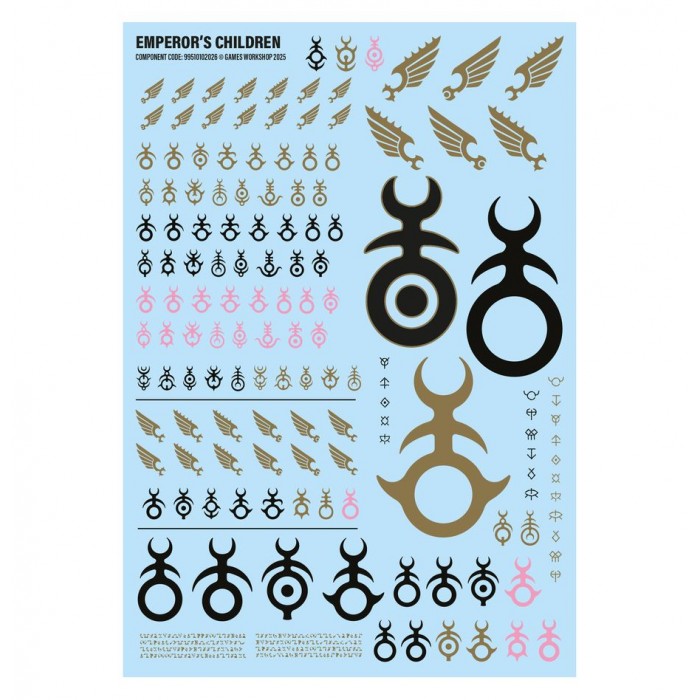 Ce kit se compose de 52 éléments en plastique, de 3x Socles Ronds Citadel de 40mm et de 1x Planche de Décalcos des Emperor's Children contenant x150 Décalcos de qualité pour décorer vos figurines.