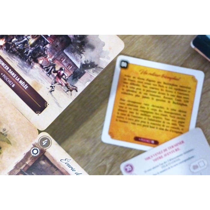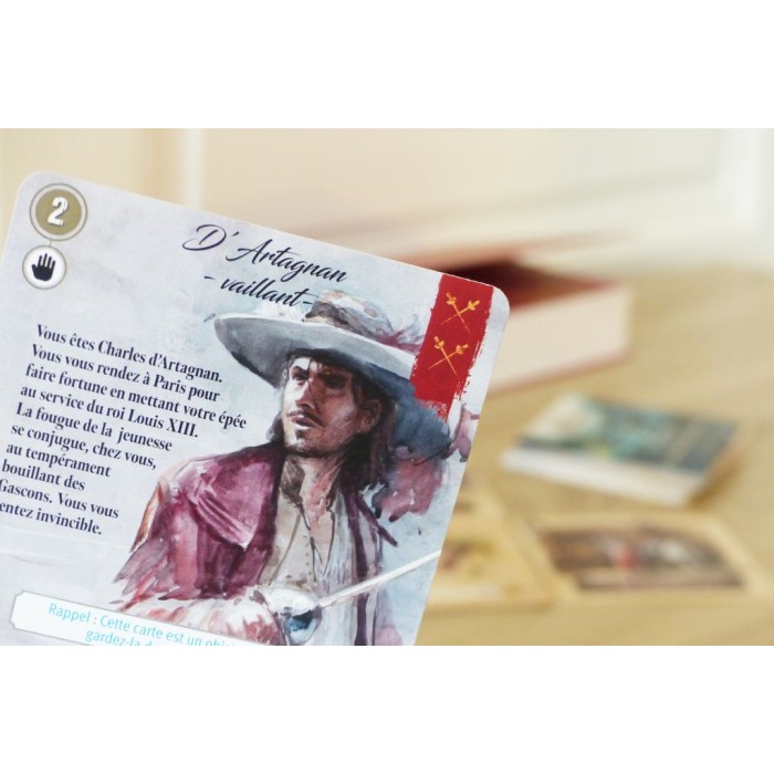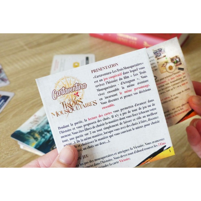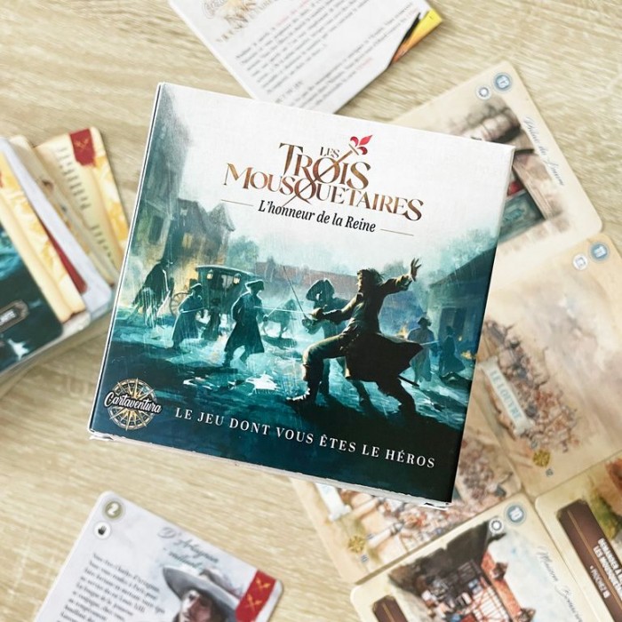 "Les Trois Mousquetaires" est une déclinaison spéciale de la gamme Cartaventura, vendue à plus de 300 000 exemplaires dans le monde. Cartaventura propose des aventures historiques au format poche, façon "Livre dont vous êtes le héros". Les joueurs construisent leur aventure à l’aide de cartes qui proposent différentes options. Ils réfléchissent ensemble aux meilleurs choix afin de suivre la trace du héros du jeu. Grâce à des scénarios riches et de magnifiques illustrations à l'aquarelle, ils sont véritablement immergés dans différentes époques de l'Histoire. Le système de jeu, simple et inédit, permet de rejouer chaque scénario plusieurs fois afin de découvrir toutes les fins possibles. Dans Les Trois Mousquetaires, découvrez 3 fins différentes, dont 2 alternatives ! SCENARIO L'HONNEUR DE LA REINE : à son arrivée à Paris, le jeune d’Artagnan fait la rencontre des trois mousquetaires et de Constance Bonacieux. Celle-ci lui fait part d’un complot du cardinal pour déshonorer la reine. De l’embuscade du Duc à la quête des ferrets, les quatre amis devront choisir entre leur esprit chevaleresque et leur loyauté envers le Roi. Leur honneur leur commande-t-il de protéger le secret de la reine ou de l’exposer et de livrer Buckingham ?