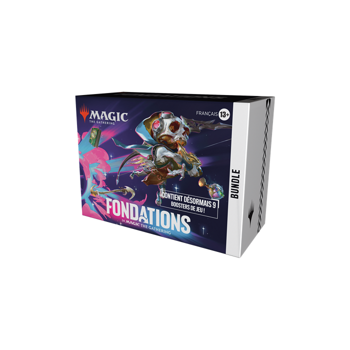 Le meilleur moment pour jouer votre première partie de Magic, c’est maintenant. Plongez dans Fondations pour créer et partager votre expérience Magic: The Gathering quintessentielle en jouant et en collectionnant des cartes sélectionnées pour donner à chaque joueur l’avantage. Ce bundle contient 9 boosters de jeu Fondations (contenant chacun 14 cartes), plus 1 carte Premium traditionnelle avec une illustration alternative exclusive au bundle, 20 cartes de terrain de base Premium traditionnelles (10 pleine illustration), 20 cartes de terrain de non-Premium (10 pleine illustration), 1 compteur de points de vie Spindown géant, 1 boîte de rangement de cartes Fondations et 2 fiches de référence.