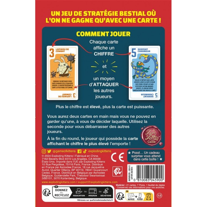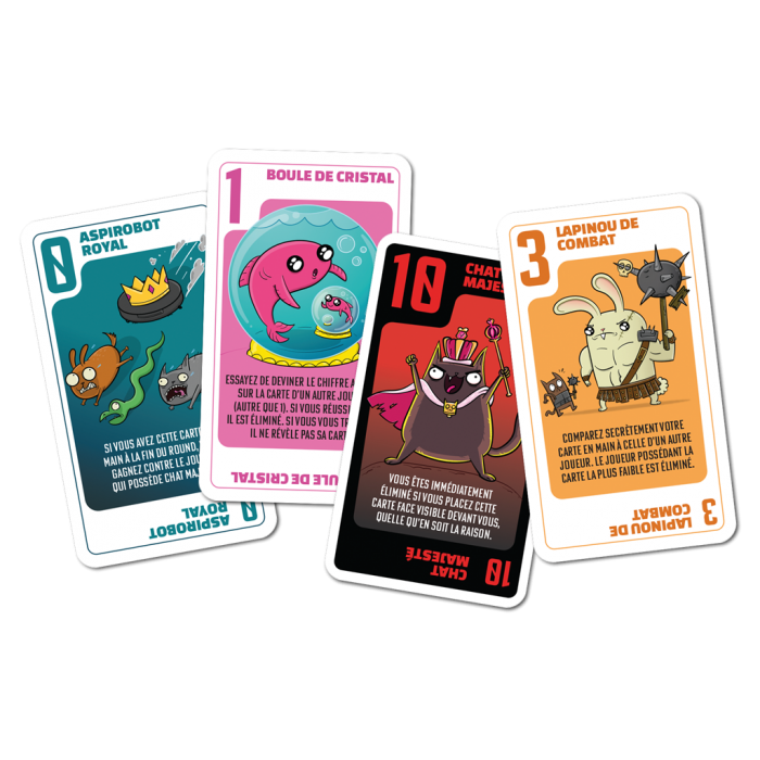 Vous avez toujours une carte en main. A votre tour piochez une nouvelle carte. Choisissez celle que vous gardez et jouez l’autre en appliquant son effet. À la fin de la manche, le joueur qui a la carte de plus grande valeur l’emporte. Un jeu malin et retors.