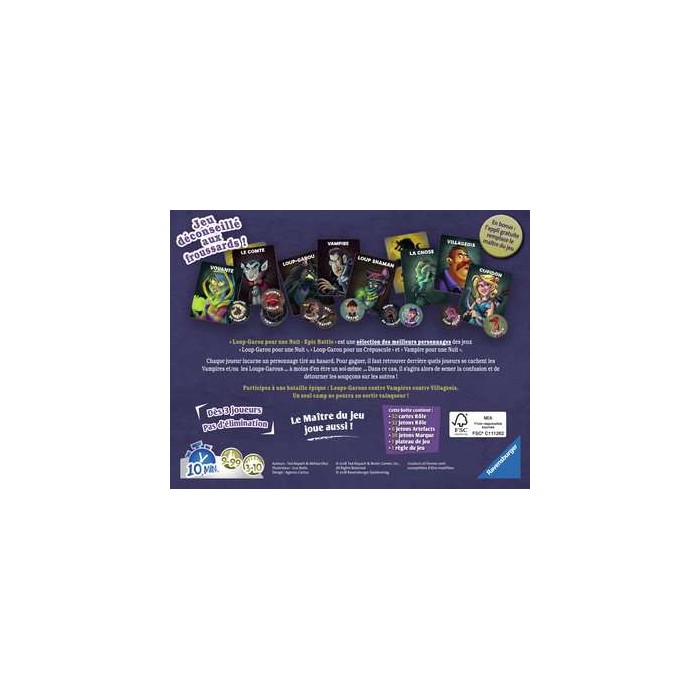 Vous savez feinter et manipuler d'une main de Maître ? Vous pensez que personne ne peut rien contre vous ? Alors vous avez frappé à la bonne porte ! Le soleil vient de se coucher. Vampires et Loups-garou chassent dans le village endormi, mais très vite tout dérape ! Heureusement certains villageois sont dotés de capacités hors du commun ! Glissez dans la peau de l'un des 30 personnages et soyez à l'affût ! Mais qui est un honnête villageois et qui est un terrible Loup Garou ou un Vampire aux dents longues ? À vous de le découvrir ! Epic Battle pack regroupe les 30 meilleurs personnages de Loup Garou pour Une Nuit, Loup Garou pour un Crépuscule et Vampire pour Une Nuit ! Vous êtes désormais prêt pour un affrontement de bluff entre créatures mystiques ! Également adapté aux petits groupes, pas d'élimination, le Maître du jeu joue aussi. En bonus : l'appli gratuite remplace le Maître du jeu ! Dès 9 ans.