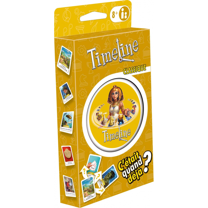 Amusez-vous à replacer les cartes correctement sur la ligne du temps ! Timeline Classique est un jeu de connaissances et de déduction dans lequel vous devrez classer des cartes aux thèmes variés dans le fil de l’histoire. Nouvelle édition, remplace l’ancien Timeline Multi-thèmes. Dès 8 ans.