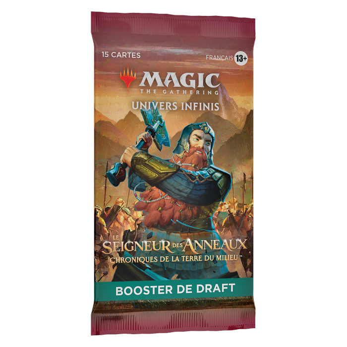 La boîte de boosters de draft Le Seigneur des Anneaux : chroniques de la Terre du milieu contient 36 boosters de draft Le Seigneur des Anneaux : chroniques de la Terre du milieu et 1 carte de présentation Premium traditionnelle. Chaque booster de draft contient 15 cartes et 1 carte publicitaire/de jeton ou d’aide, y compris 1 carte de rareté rare ou supérieure, 3 cartes inhabituelles, 10 cartes courantes et 1 carte de terrain. Une carte rare mythique sans bordure Premium traditionnelle dans <1 % des boosters. Une carte Premium traditionnelle de rareté aléatoire remplace une carte courante dans 33 % des boosters.