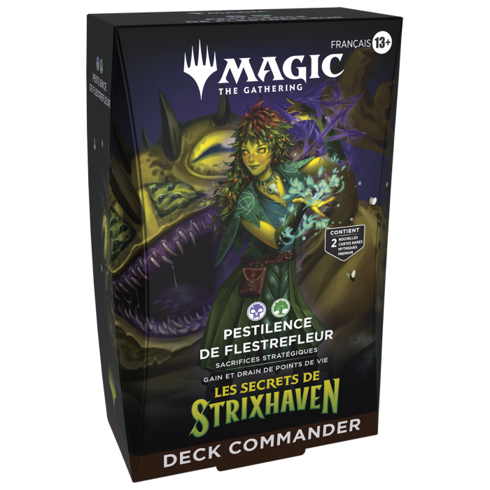 Découvrez le format multijoueurs le plus populaire de Magic avec cinq decks de 100 cartes prêts à jouer, chacun possédant un style de jeu unique à deux couleurs. Choisissez votre université d'études magiques et poursuivez votre éducation dans le monde d'Arcavios. Chaque deck Commander Les secrets de Strixhaven contient deux cartes de créature légendaire Premium traditionnelles rares mythiques, qui arborent une illustration sans bordure et qui peuvent devenir votre commandant. Chaque deck introduit 12 cartes Commander inédites dans Magic: The Gathering.