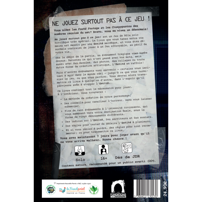 Ne jouez surtout pas à ce jeu ! est un JDR solo horrifique très spécial. Le livre que vous tenez entre vos mains est maudit par une Entité mystérieuse, et vous êtes désormais contraint de jouer à un jeu diabolique, au péril de votre vie.