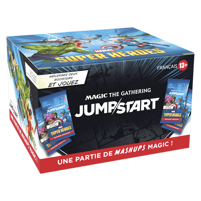 Le jeu aux combinaisons chaotiques s’associe à l’univers Marvel ! Prenez simplement deux boosters, mélangez-les et vous voilà prêt à jouer. Chaque booster contient tous les terrains dont vous pourriez avoir besoin, ainsi que l'un des 51 thèmes possibles de Marvel Super Heroes, combinez-en deux pour rassembler l'équipe de super-héros et de super-vilains de vos rêves, avant d'utiliser leurs redoutables capacités. Avec une construction de deck instantanée et de délicieux combos à thème, Jumpstart est parfait pour livrer une partie rapide ou apprendre à vos amis et à votre famille à jouer à Magic en s’amusant.