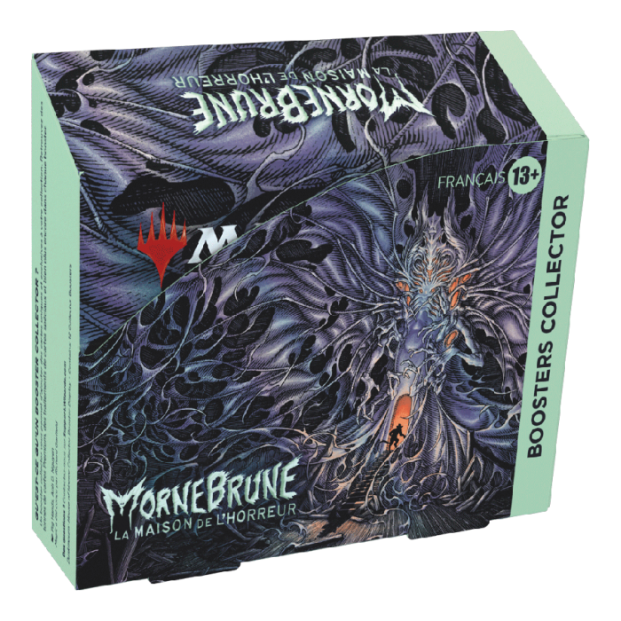 Déverrouillez l'aile des expositions de Mornebrune et emparez-vous des trésors les plus précieux de la Maison avant que la Maison ne s'empare de vous ! Chaque booster collector débordant d’esprits sinistres contient des cartes rares et/ou rares mythiques, des cartes Premium traditionnelles, des cartes sans bordure et des terrains pleine illustration.