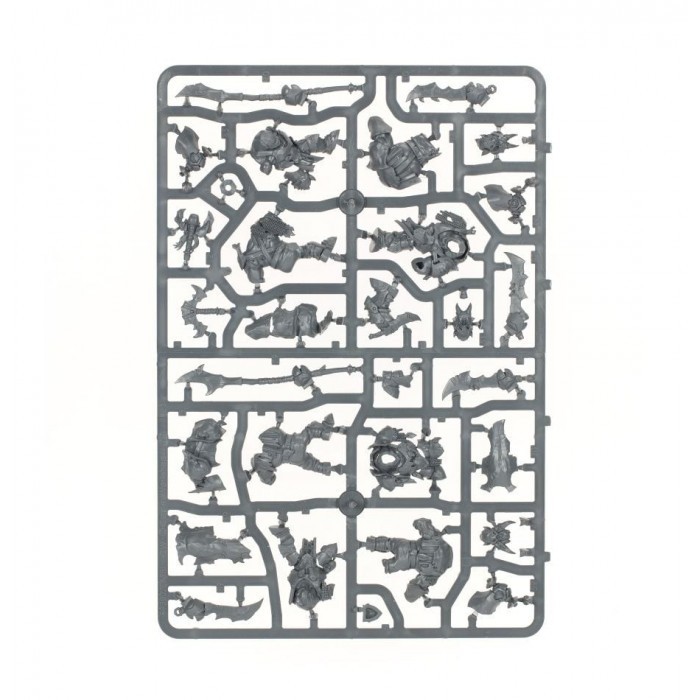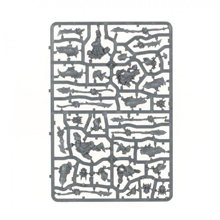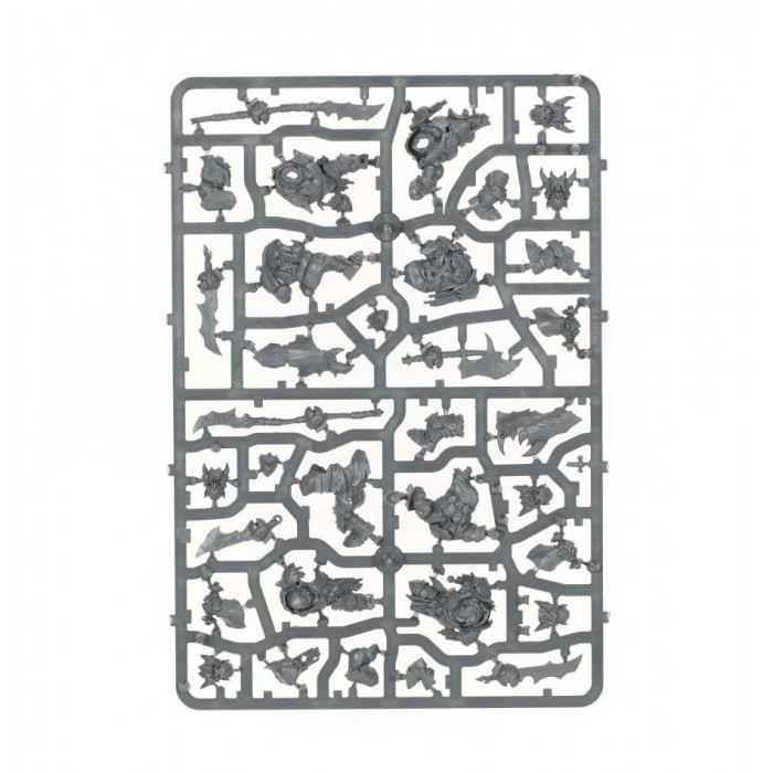 Les Durboys Orruks se ruent dans la mêlée en poussant des cris déments et dans le boucan de leurs armures de plates en fonte. Ces hordes de combattants féroces et couturés de cicatrices se fraient un chemin à travers les rangs ennemis à l'aide de toutes sortes d'armes grossières mais affreusement tranchantes, repoussant les représailles et les ennemis malchanceux à coups de boucliers lourds. Ce kit plastique permet d'assembler 10 Durboys Orruks, les combattants de première ligne des clans Mâchefers. Chaque Durboy porte un lourd bouclier semblable à une dalle, et peut être armé soit d'un kikoup' soit d'un kitrou' à longue hampe. Vous pouvez assembler une figurine en Boss Durboy avec un kikoup' unique et un choix de têtes, et une autre figurine comme Porteur de Glyphe de Gorkamorka qui arbore, monté sur son dos, un glyphe parmi deux au choix. Vous trouverez une grande variété de têtes, de boucliers, de mains et d'armes différents et qui sont tous interchangeables: aussi grosse que soit votre Waaagh!, vous pourrez faire en sorte que vos Mâchefers forment une foule vraiment éklektik. Ce kit est composé de 98 éléments en plastique et est fourni avec 10x socles ronds Citadel de 32mm. Ces figurines sont fournies non peintes et nécessitent assemblage – nous recommandons d'employer la Colle Plastique Citadel et la peinture Citadel.