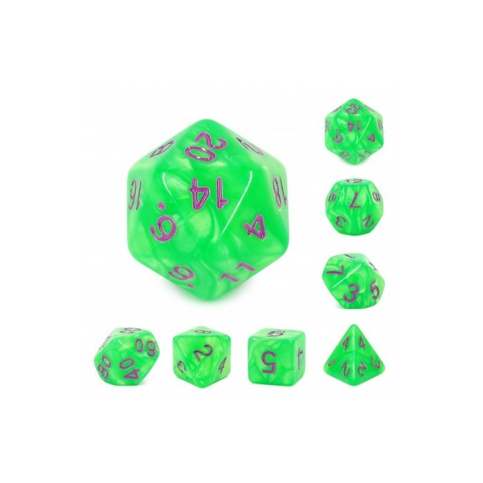 Set de 7 dés – Green Pearl (Purple font)
