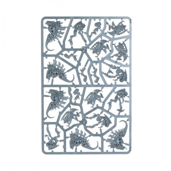 Ce kit plastique permet d'assembler cinq Barbgaunts, des créatures tyranides conçues pour servir d'artillerie biologique. Chacun de ces gros gaunts voûtés est fusionné à un lance-barbillons grotesque. Cinq de leurs membres servent à soutenir cette arme vivante ou à fournir une plate-forme de tir stable, tandis que le sixième est réduit à l'état de griffe atrophiée. Ces bêtes de somme sont contrôlées par des parasites cérébraux, dont les tentacules charnus plongent dans le crâne dépourvu d'yeux du Barbgaunt pour diriger ses tirs organiques.